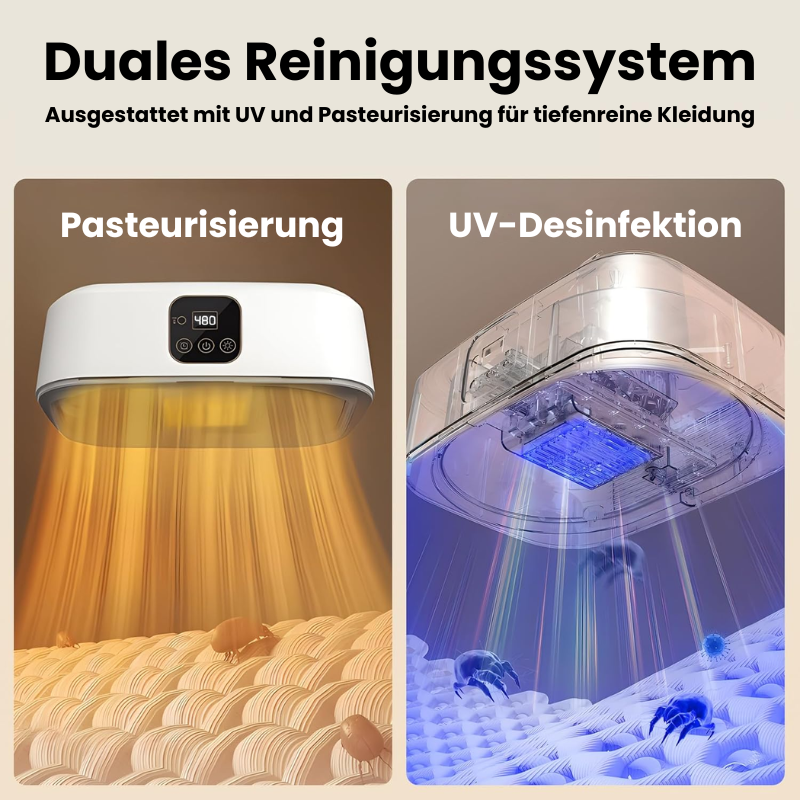 • Zwei-Phasen-Reinigungssystem: Integriert mit einem eingebauten LED-UV-System zur Desinfektion von Kleidungsstücken, um sicherzustellen, dass die Kleidung nicht nur trocken, sondern auch sauber ist, dank der zweiphasigen Reinigung durch Hitze und UV-Licht.